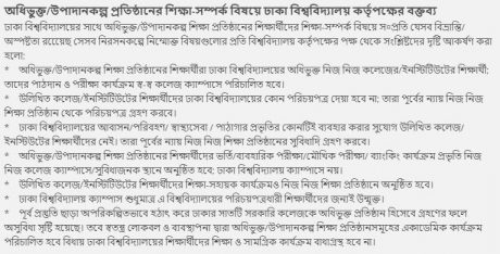 বিজ্ঞপ্তিতে আরও বলা হয়, অধিভুক্ত/উপাদানকল্প শিক্ষাপ্রতিষ্ঠানের শিক্ষার্থীদের ভর্তি/ব্যবহারিক পরীক্ষা/মৌখিক পরীক্ষা/ ব্যাংকিং কার্যক্রম প্রভৃতি স্ব স্ব কলেজ ক্যাম্পাসে/সুবিধাজনক স্থানে অনুষ্ঠিত হবে; ঢাকা বিশ্ববিদ্যালয় ক্যাম্পাসে নয়। উল্লিখিত কলেজ/ইনস্টিটিউটের শিক্ষার্থীদের শিক্ষা-সহায়ক কার্যক্রমও স্ব স্ব শিক্ষাপ্রতিষ্ঠানে অনুষ্ঠিত হবে।