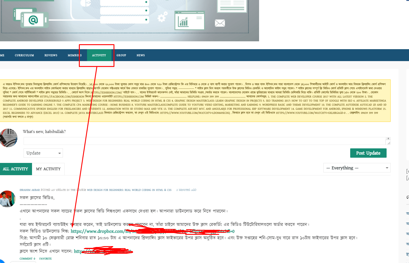 ওয়েব ডিজাইন, সিপিএ, ইউটিউব, এফিলিয়েট এবং অটোক্যাড কোর্সের ফ্রিল্যান্সিং ক্লাসে জয়েন লিঙ্কও উক্ত একটিভিটিতে দেওয়া আছে।