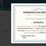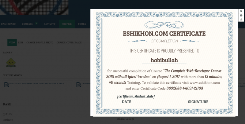 আমাদের ইশিখন.কম এর ১৭৩ ব্যাচ (অক্টোবর ২০১৭ ব্যাচ) এর সকল শিক্ষার্থীর সার্টিফিকেট নিজ নিজ প্রোফাইলের সার্টিফিকেট অপশনে পাবেন। আপনি উক্ত সার্টিফিকেট ডাউনলোড করে নিতে পারবেন।
