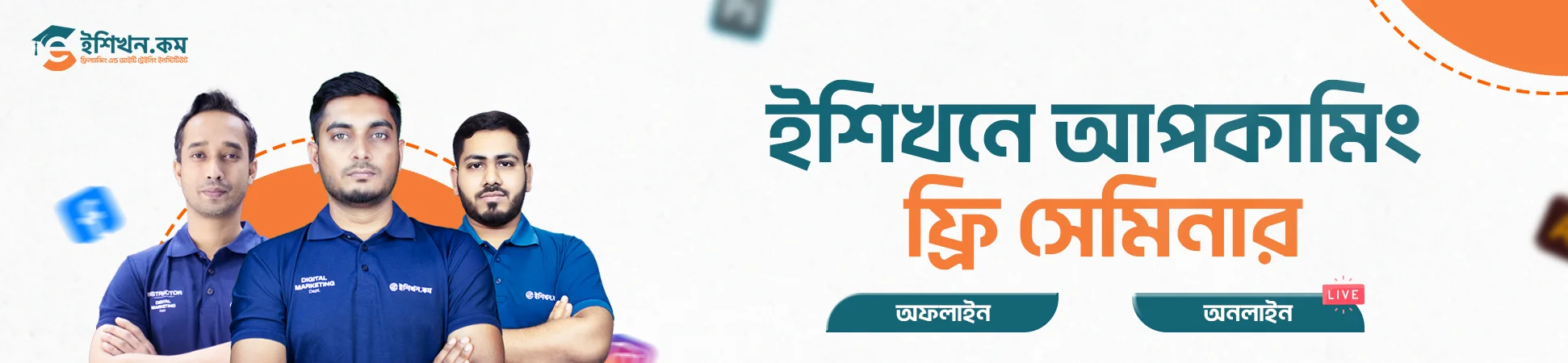 বিঃদ্রঃ ফ্রি অফলাইন সেমিনার এর জন্য রেজিস্ট্রেশন সম্পন্ন করার পর ইশিখন থেকে কল/মেইল/মেসেজ করে আপনার আসন টি নিশ্চিত করবে।